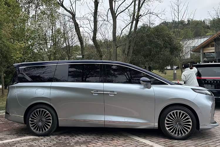 车侧一面,作为一款车长达5米3的中大型MPV,其车身整体显得修长且魁梧。而其不规则样式的个性化隐藏式D柱以及大尺寸悬浮式车顶样式,搭配密幅式轮毂,则同样能显露其侧颜的“大佬”气质与年轻、个性属性。