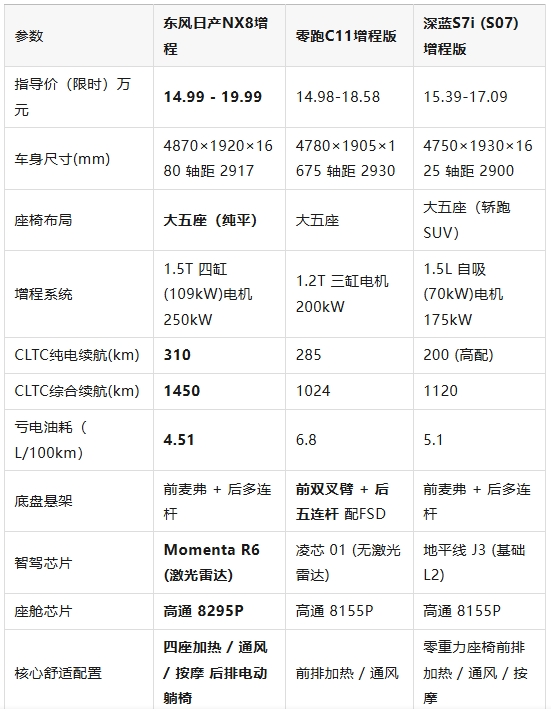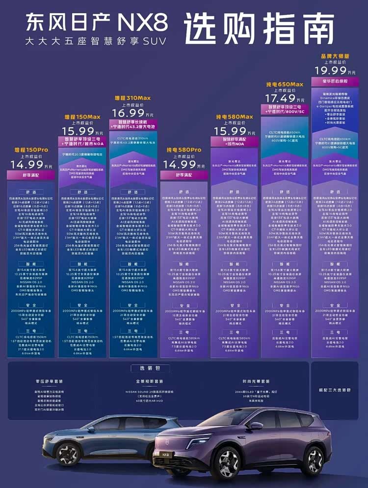 对比国产新能源系列,零跑 C11 增程版深蓝 S7i 增程版,NX8的空间优势明显,全系标配有更多可圈可点的地方,看看官方提供的选购指南手册,每款配置差距并不大,价格衔接紧密。最重要的是全系价格打到20万内,入门价格15万级,长续航大空间,以及日系造车的口碑,让用户在选择上对合资SUV有了新的认识,增加购买意向。