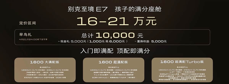 4月10日,官方正式公布了 别克至境E7(参数|询价)的相关配置与上市细节。这款新车计划推出3款车型,定价区间锁定在16-21万元,上市时间确定为4月22日。值得一提的是,官方针对这款新车推出了总计10000元的早鸟礼,为意向消费者提供了一定的购车福利。别克至境E7采用大五座布局,搭载插电混动系统,纯电续航和综合续航表现均衡,既能满足日常城市通勤,也能应对中长途出行需求,整体定位贴合家庭用户的实际使用场景。