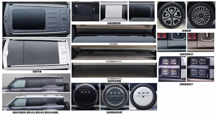 车尾处,新车则采用了上窄下宽式的设计,同样采用硬派越野最为常见的外挂式备胎设计,同时备胎罩上粘贴有“GWM”标识;纵置尾灯组同样采用矩形元素,不过整体的样式与哈弗品牌其它车型还有多有类似,同时后包围也采用车身同色的搭配,看上去足够“壮硕”,但辨识度并不是十足清晰。