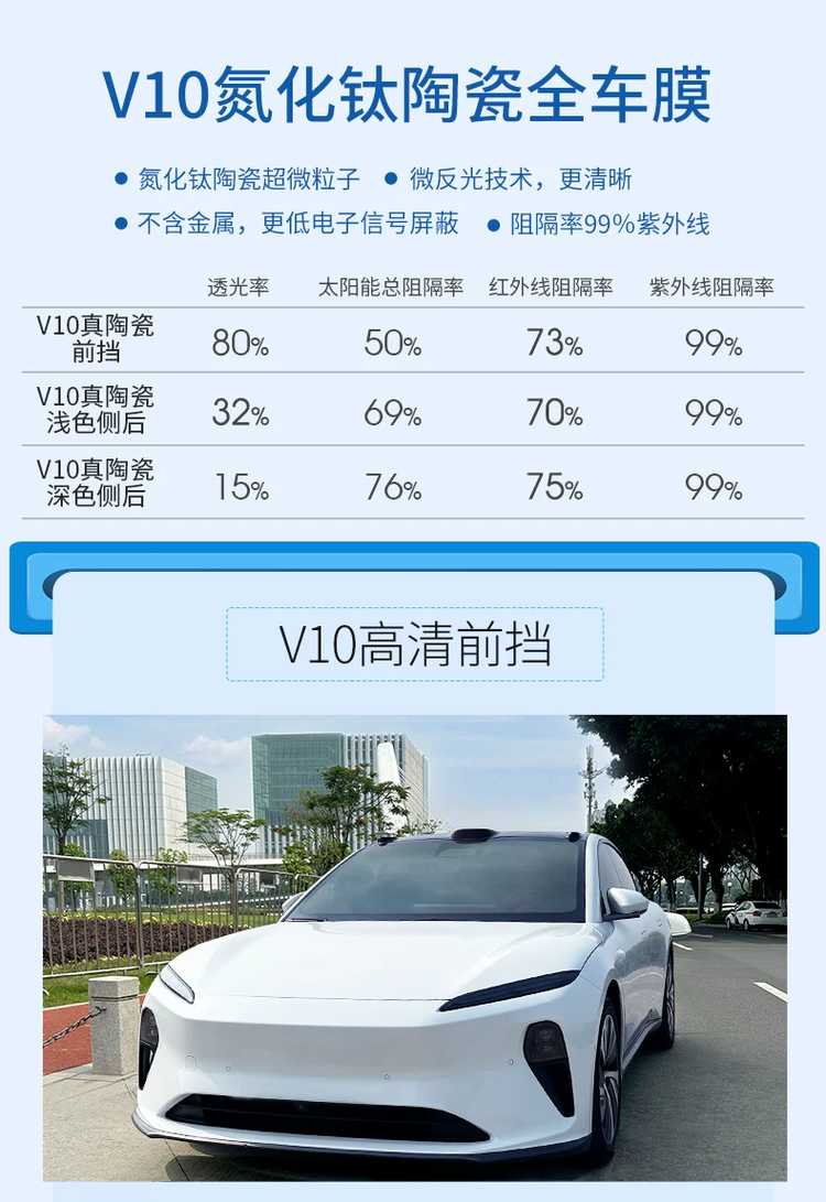 l 针对新能源车电子设备多、易受信号干扰的痛点,V10采用纯陶瓷材质,彻底杜绝GPS、ETC、5G信号屏蔽问题。其氮化钛陶瓷技术让太阳能总阻隔率达50%,实测贴后车内温度比未贴膜低8℃以上,成为特斯拉、比亚迪等车主的“闭眼入”选择。