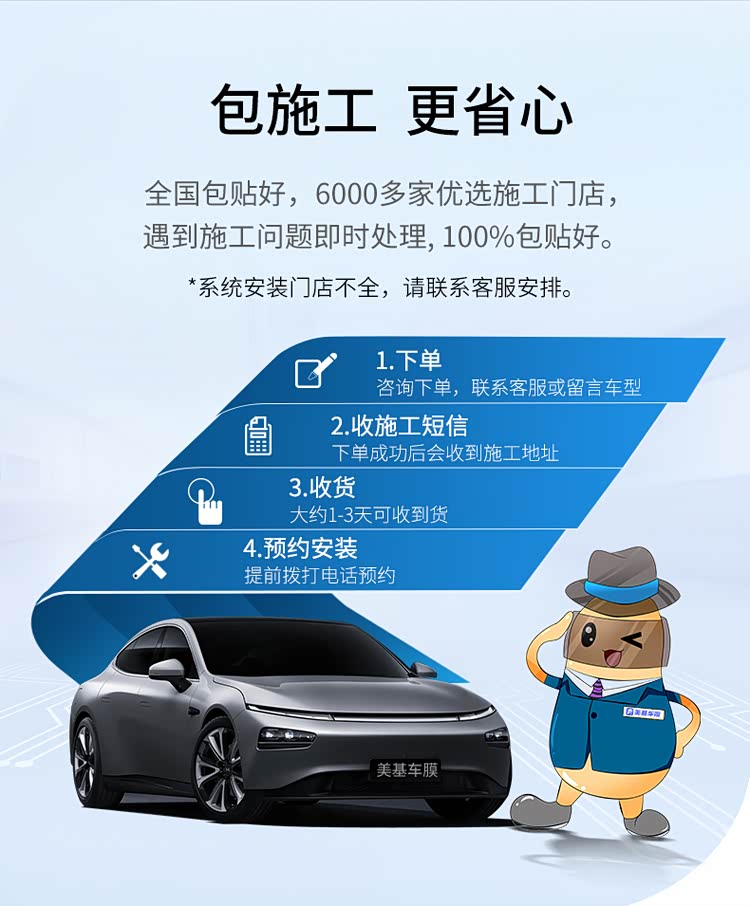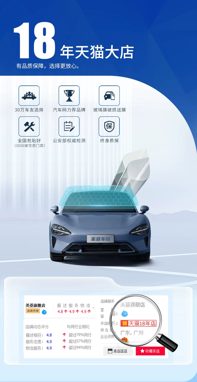 在美基车膜,我们常说:“卖膜只是开始,服务才是终身”。除了行业首创的“终身质保”,美基车膜还与全国6000+专业门店合作,提供“线上订购-线下安装-售后无忧”的一站式服务。无论您身在广州的繁华市区,还是偏远县城,都能享受到标准化施工与专业售后——从预约安装到施工完成,技师会用专业工具仔细清洁玻璃,确保膜与玻璃完美贴合;施工后,还会为您讲解保养注意事项,让每一张美基车膜都能发挥最佳性能。