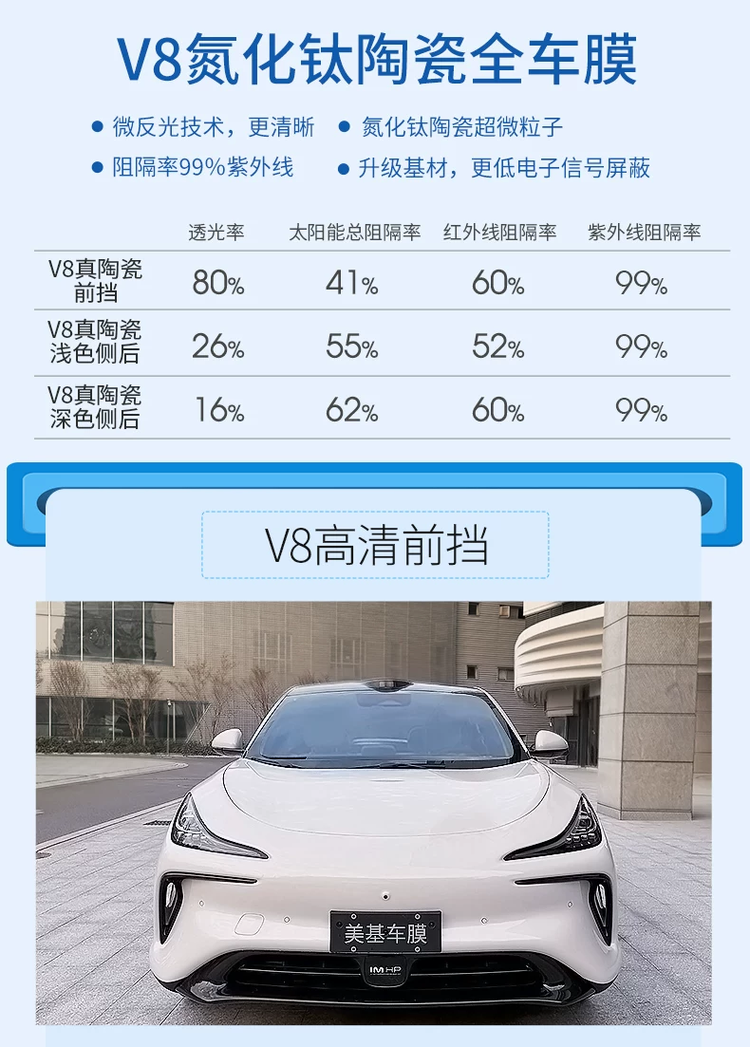 l 针对预算有限但追求品质的新车主,V8以千元内的亲民价格,提供99%紫外线阻隔率与稳定隔热性能,有效保护内饰延缓老化,成为“人生第一张好膜”的高性价比之选。