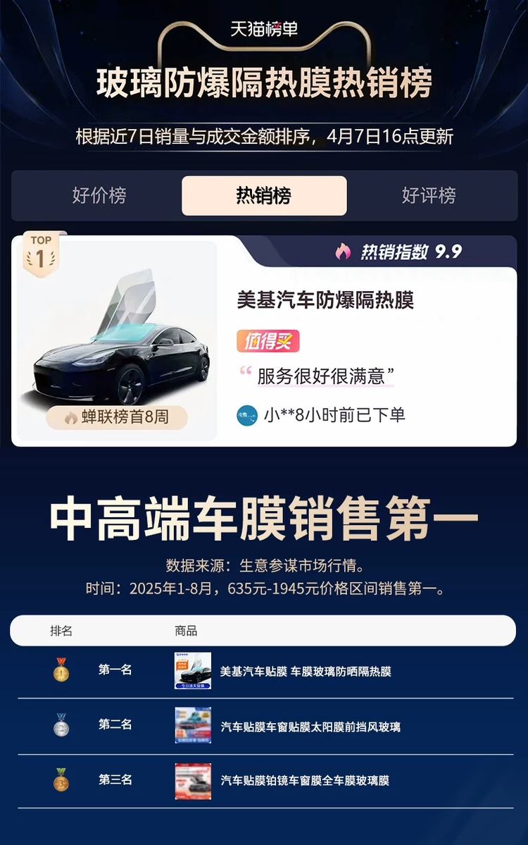 这份对品质的执着,让美基车膜在18年里收获了无数“硬核认可”:作为中国环塔(国际)拉力赛的官方车膜合作伙伴,美基车膜的产品在“地球最严酷赛道”上经历了-30℃极寒与50℃酷热的考验——当赛车在沙漠中飞驰,车内温度高达60℃时,美基车膜依然能稳定隔热,保护车手免受暴晒;斩获2025天猫汽车“金驰奖”,蝉联多个主流电商平台隔热膜品类销量冠军,这些荣誉背后,是千万车主用“复购”与“推荐”投出的信任票。
