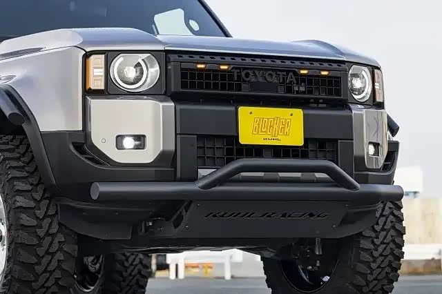 LC250拥有两套外观设计,KUHL RACING选择了更复古的圆灯造型版本,圆形复古大灯搭配黑色蜂窝状格栅,让车头既有野性张力,又不失细节精致度。原厂前包围基础上增加专属前保险杠保护器。直径超过70mm的粗钢管采用“向上翘起”的独特设计,既巧妙避开了原厂包围,又营造出强烈的运动感。底部那块印有“KUHL RACING”标志的钢板,如同一面坚固的盾牌,宣示着它的越野底气。
