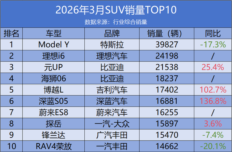 随着车市传统淡季结束,3月国内SUV市场迎来回暖,销量格局进一步向新能源倾斜。最新发布的行业综合销量数据显示,3月SUV销量前十中新能源车型占据6席,传统合资品牌仅剩3款车型上榜且多数出现同比下滑,自主与新势力车企已全面掌握市场主动权。