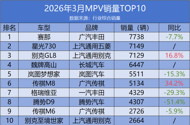 3月国内MPV市场迎来新一轮深度洗牌,竞争格局愈发胶着。最新行业综合销量数据显示,3月MPV销量榜单中,合资老将与自主新军展开贴身肉搏,头部车型销量差距大幅收窄,多款全新车型快速上量,曾经被合资品牌长期垄断的中高端MPV市场,正被自主车企全面突破。