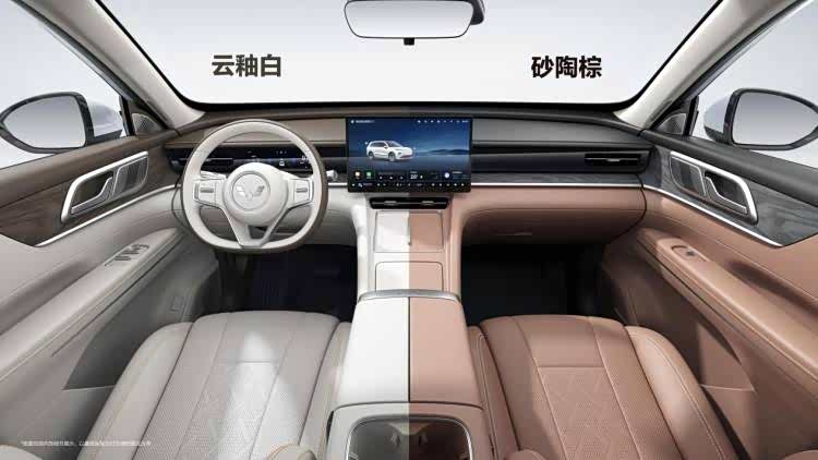五菱星光L内饰比较简约,提供云釉白、砂陶棕两种配色,中控整体呈现对称的T型布局,使用了8.8英寸仪表屏+15.6英寸中控屏,配备256色全色域呼吸氛围灯,副驾老板键、二排小桌板等配置。