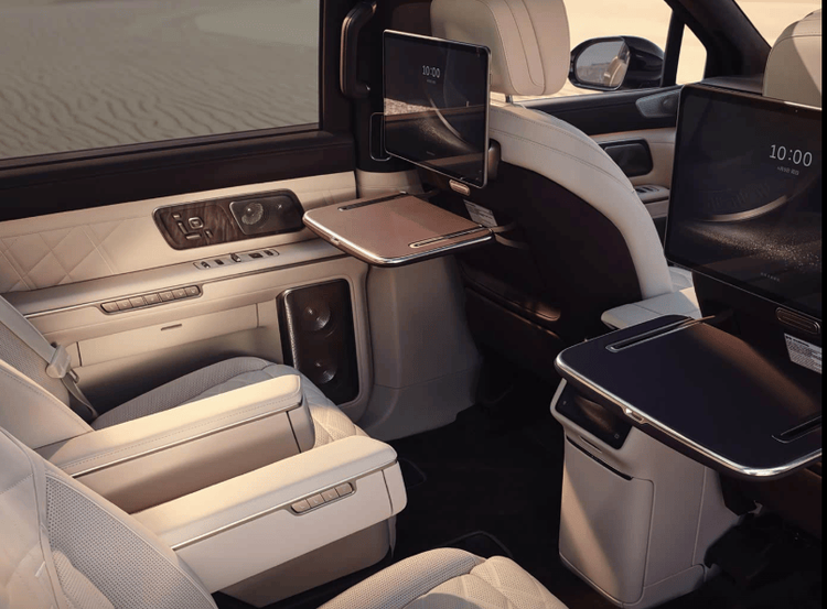 车内座椅采用2+2+2六座布局,并且后排会提供中岛版和过道版,其在二排中央区域配备8英寸操控屏以及两个隐藏式小桌板。车辆后排将会配备飞航零重力座椅,支持加热、通风以及按摩等功能。
