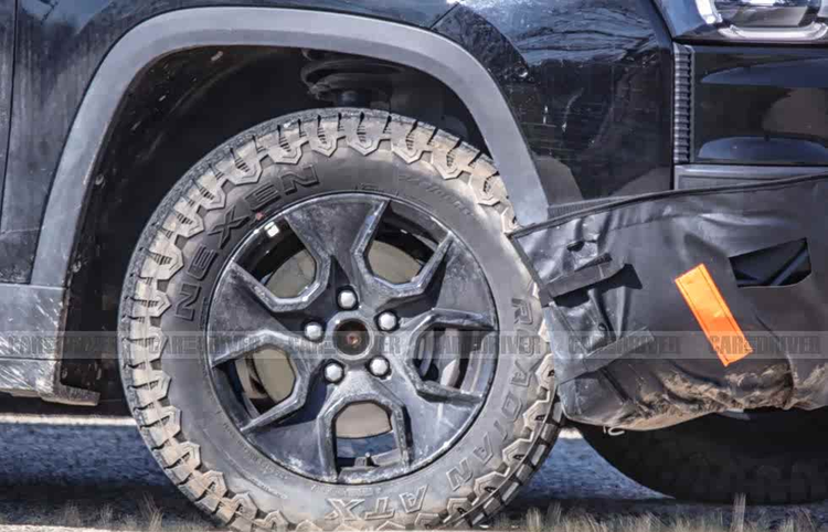 虽然新车的整体轮廓和普通版第六代切诺基保持一致,但只要仔细观察,就能发现诸多Trailhawk专属的越野细节,这些细节不是简单的装饰,每一处都为提升越野性能服务。最容易被注意到的,就是它换装的Nexen Roadian ATX全地形轮胎,规格为245/65R17,这种轮胎的胎纹设计更适合复杂路况,无论是泥泞路段还是碎石路面,都能提供更好的抓地力,这也是越野车型最基础也最关键的配置之一。除此之外,车辆的前后保险杠都被伪装胶带覆盖着,这也意味着量产版本会采用全新的造型设计,从伪装的轮廓能看出,新保险杠会进一步优化接近角和离去角,相比普通版有明显优势,这对于提升车辆的越野通过能力至关重要,毕竟在复杂越野场景中,接近角和离去角直接决定了车辆能否顺利通过陡坡、障碍物。同时,保险杠上还预留了拖车钩的安装位置,日常越野时如果遇到车辆陷困,拖车钩就能发挥实用作用,不用额外改装。值得一提的是,测试车的伪装胶带并没有完全覆盖车身,在车身侧面能清晰看到Trailhawk专属徽章的轮廓,这也进一步确认了这款测试车的身份。