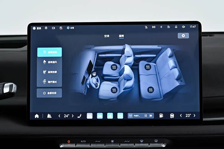 内饰上,至境E7全系标配8.8英寸仪表+15.6英寸中控屏,支持CarPlay、HiCar、CarLink。全系42项舒适配置,包括零重力座椅、方向盘加热、电动尾门、5mm双层静音玻璃+ANC主动降噪。高配版本还提供15.6英寸二排影院屏、7.1.4声道20扬声器杜比全景声音响、银离子冷暖箱及多功能桌板,副驾配伊姆斯零重力躺椅等功能。