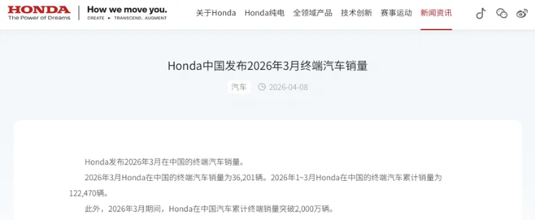 4月8日,本田中国公布的最新销量数据,把这家老牌日系车企的窘境摆在了台面上。2026年3月,本田在华终端汽车销量仅36201辆,同比暴跌34.34%,创下近年同期最低水平;整个一季度累计销量122470辆,同比下滑22.43%。算下来,2025年全年也不过64.53万辆,较巅峰期162.7万辆缩水了近100万辆。
