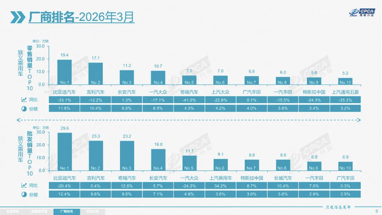 这张3月成绩单传递的信号很清晰:车市从"增量竞争"彻底转入"存量绞杀"。前十名八家跌,说明不是谁做错了什么,而是整个池子就这么大,你多喝一口别人就少一口。