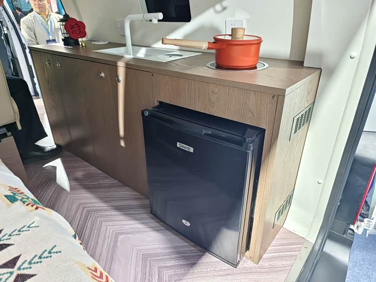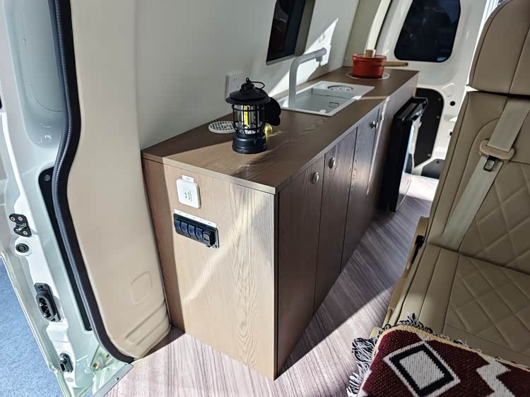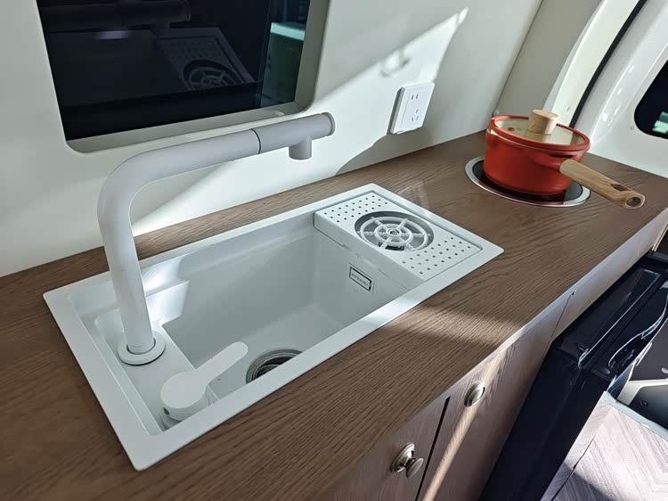 车内右侧的水槽和电磁炉,宿营的时候可以在这里进行简单的烹饪。