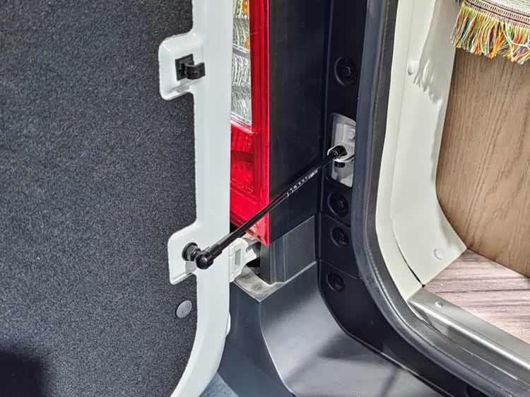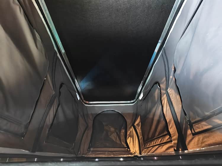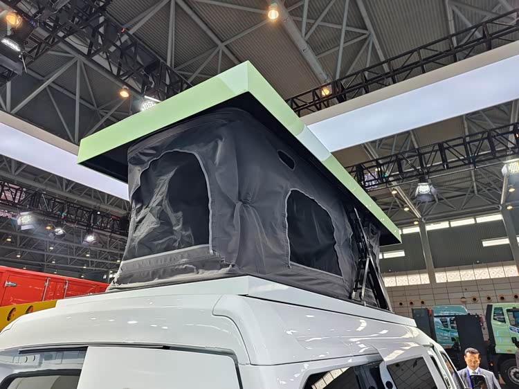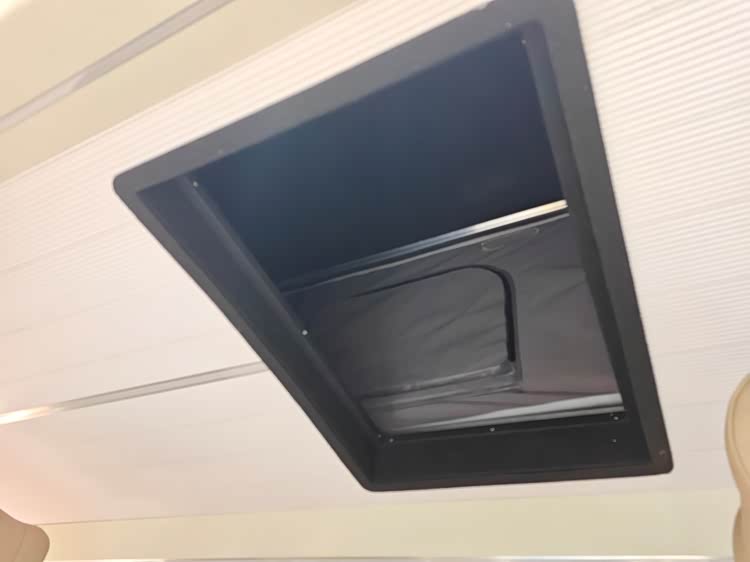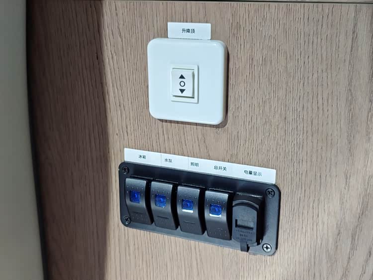 原来这里是车顶的升降帐篷,升降开关就在侧拉门的门口左侧,一按开关海豚K7宿营车的车顶就长高了。