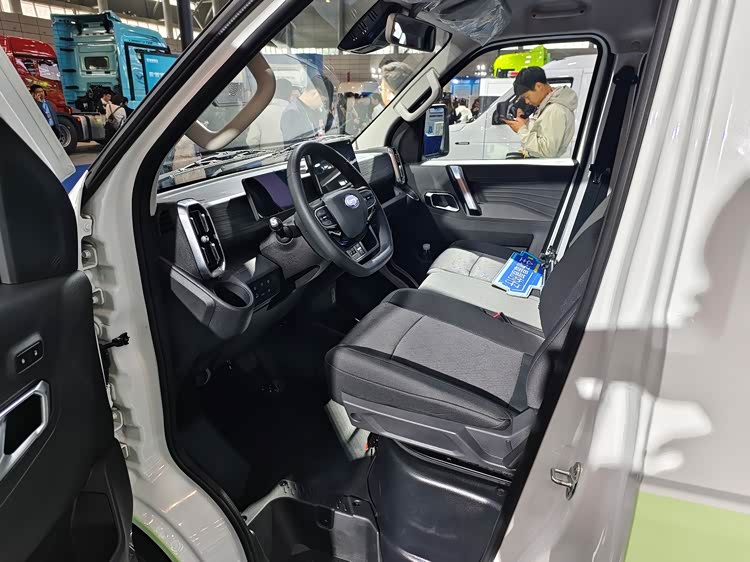海豚K7露营车驾驶区满满乘用化内饰风格,采用上灰下黑内饰,黑色仪表台上采用简约的木纹装饰,造型美观优美,富有北欧风情。车上配有多功能方向盘、8.8吋液晶仪表、12.3吋液晶大屏、电子手刹、360全景影像、ABS+EBD、倒车雷达、倒车影像、胎压监测、蓝牙音响等功能,操作方便。主副驾座椅带有双安全气囊,有利于保障行车安全。智能化、网联化的技术也在车上成功应用,驾驶员可以通过手机APP控制车上的功能,让驾驶更为便利、舒适。