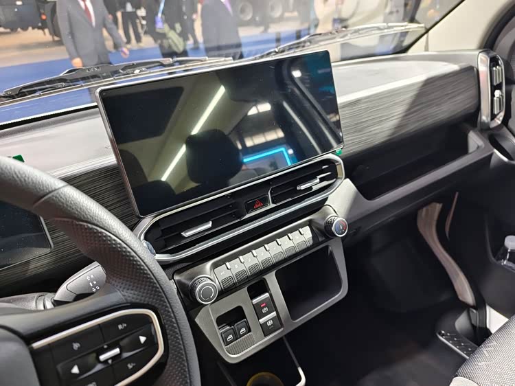 液晶大屏下方设有空调出风口、危险报警闪光灯开关、空调旋钮、开关面板、电子手刹、储物槽
