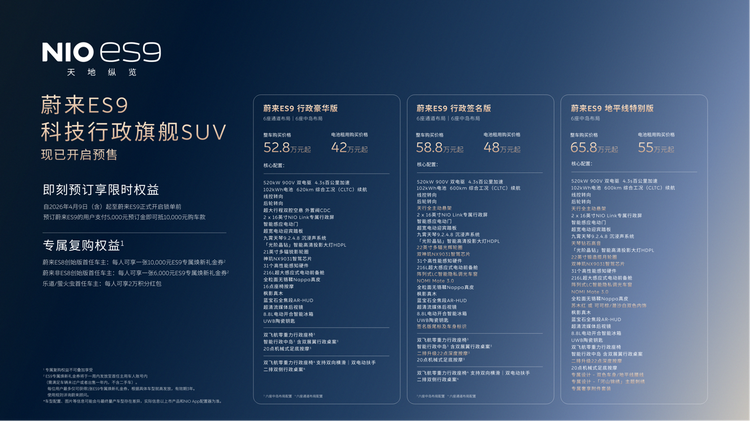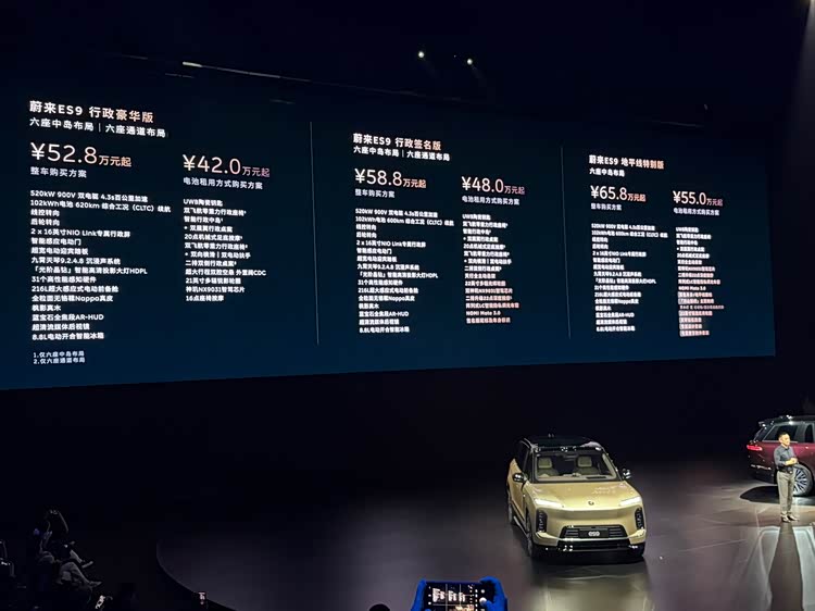 昨日,蔚来官方宣布纯电行政级旗舰SUV 蔚来ES9(参数|询价)开启预售,新车共推出3款车型,预售价区间为52.8万-65.8万元,租用方式购买预售价42万-55万元。