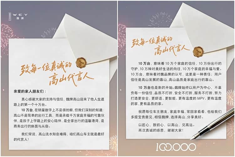 从一封温情满满的感谢信,到十万个家庭的真心托付,魏牌高山用最朴素的方式,诠释了长城汽车与用户之间“高山流水遇知音”的深厚情谊。来自十万家庭的信赖赋予了魏牌高山不断前进的底气,魏牌高山将继续“以用户为中心”,守护每一个家庭出行的幸福感与安心感!