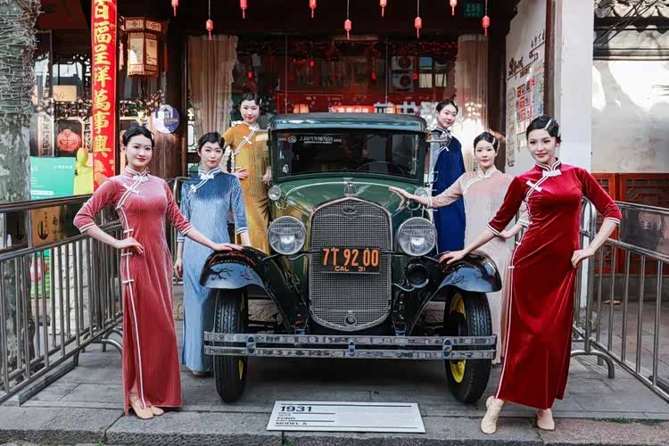 依然是3月,博物馆的1931 Ford Model A和1968 Rover P5B在南翔老街亮相,静态的展示配合民国旗袍专业模特走秀,波点裙舞蹈,整个画面马上鲜活了起来,让人回到过去的时代,演绎一场国风偶遇古董车的浪漫。