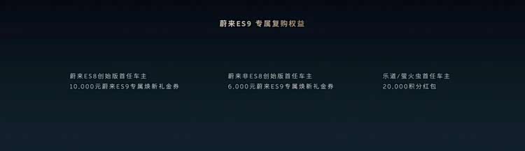 自 2026年4月9日(含)起至正式上市发布前,预订蔚来ES9的用户,将享受限时预订权益,支付5,000元预订金,可抵扣10,000元购车款。蔚来还为老用户提供了ES9的专属复购礼遇:蔚来ES8创始版首任车主可享10,000元ES9专属焕新礼金券,蔚来非ES8创始版首任车主可享6,000元ES9专属焕新礼金券;乐道、萤火虫首任车主每人可享 2 万复购积分红包。
