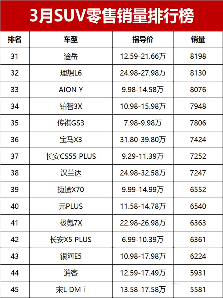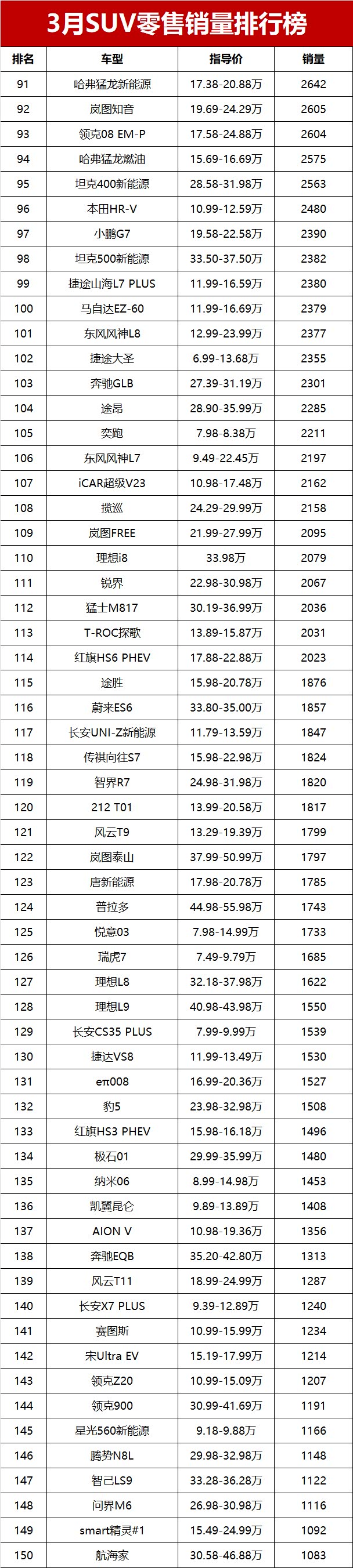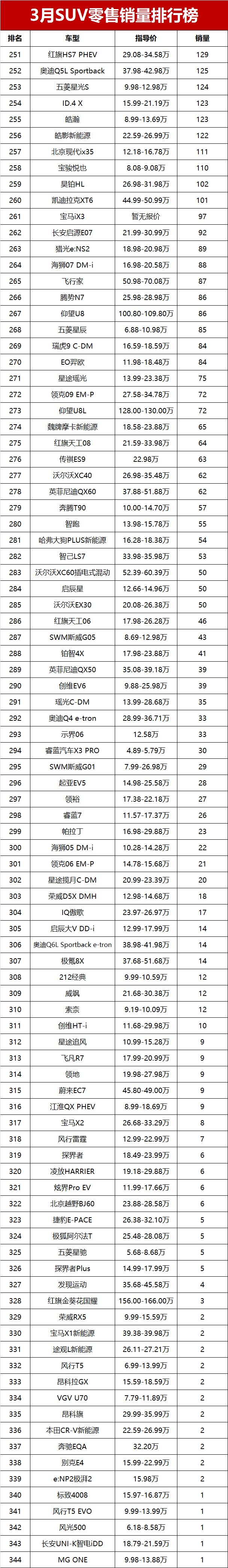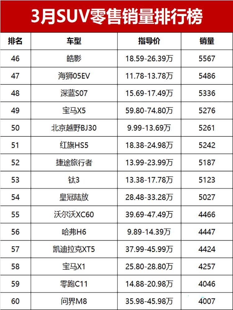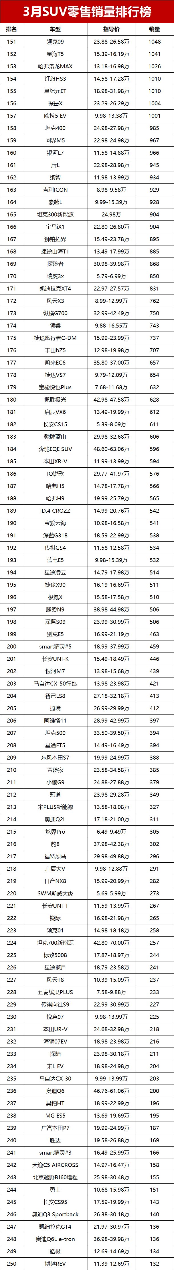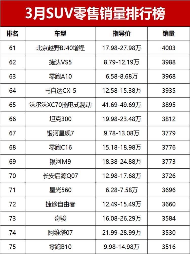 10万以内代步SUV也有不少亮点,长安启源Q05以12568辆的销量排名第二十一位,缤越以12218辆的销量排名第二十二位,价格亲民、实用性强成为它们的核心优势。最便宜的SUV瑞虎3x,指导价5.79-6.99万,3月卖出850辆,排名第一百七十位,依旧是预算有限消费者的首选。