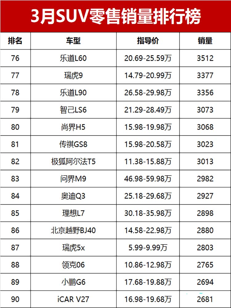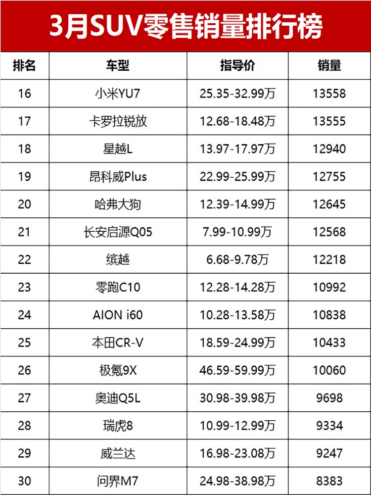 【2026年3月SUV零售销量排行榜】3月车市旺季遇冷,表现疲软。乘联会数据显示,2026年3月国内乘用车零售164.8万辆,同比大跌15.0%,超出市场预期。SUV细分市场零售89.3万辆,同比下跌6.0%,虽跌幅低于轿车(24.8%)和MPV(11.6%),但仍难掩车市整体低迷。新能源与合资燃油SUV各有表现,市场两极分化明显,3月SUV销量榜来袭,26款车破万,冠军狂销近4万辆!