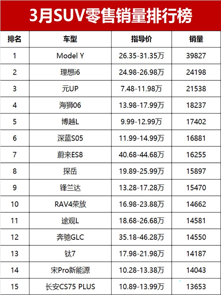 具体来看,3月破万SUV共26款,新能源与燃油SUV各13款,市场竞争趋于均衡,但新能源包揽前四。特斯拉Model Y以39827辆断层夺冠; 理想i6(参数|询价)以24198辆居次,首次突破2万辆;比亚迪元UP以21538辆拿下第三。此外,海狮06(18237辆)、博越L(17402辆)分别排名第四、五位,表现不俗。