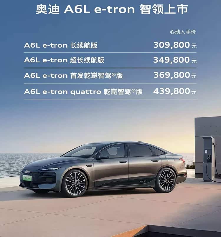 4月10日,我们从一汽奥迪的官方渠道了解到, 奥迪A6L e-tron(参数|询价)已经正式推向市场,并推出了四种配置车型,其中心动车型的价格范围在30.98万至43.98万元之间。奥迪A6Le-tron是一汽奥迪基于PPE纯电平台设计的一款全新的中到大型轿车,它提供了单电机后驱和双电机四驱两种动力选择。在CLTC工况下,该车的纯电续航里程可以达到高达815公里。