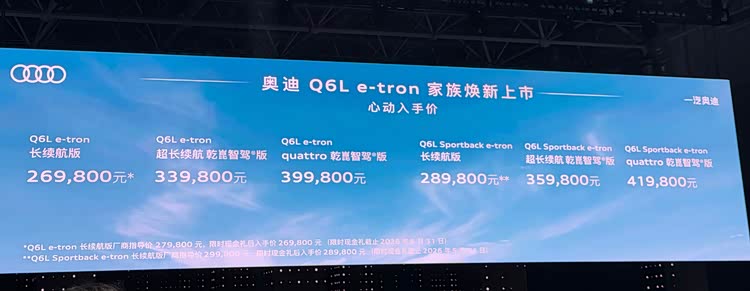 4月10日,一汽奥迪旗下两款基于PPE豪华纯电平台的重磅车型——奥迪 A6Le-tron、Q6L e-tron家族智电双旗舰联袂上市。其中 奥迪A6L e-tron(参数|询价)共推出4款车型,心动入手价30.98万-43.98万元;奥迪Q6L e-tron家族共推出6款车型,心动入手价为26.98万-41.98万元。作为奥迪在华“油电混共进全智”战略的关键落子,这两款旗舰产品不仅展现了德国精工与中国前沿科技深度融合的最新成果,也标志着奥迪正式迈入了豪华电动出行的全新时代。