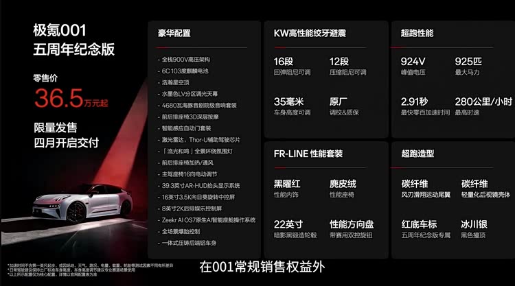 豪华配置上,纪念版打造行业唯一“星空音乐厅”座舱,500颗星光星空顶、4680瓦海豚音剧院音响、向日葵旋转屏,配合FR?LINE性能套装与碳纤维空气动力学套件,实现“可街可赛、满配豪华”的典藏价值。这不仅是一款限量车型,更是极氪五年技术沉淀的集大成之作,完成从产品到收藏品的价值跃迁。