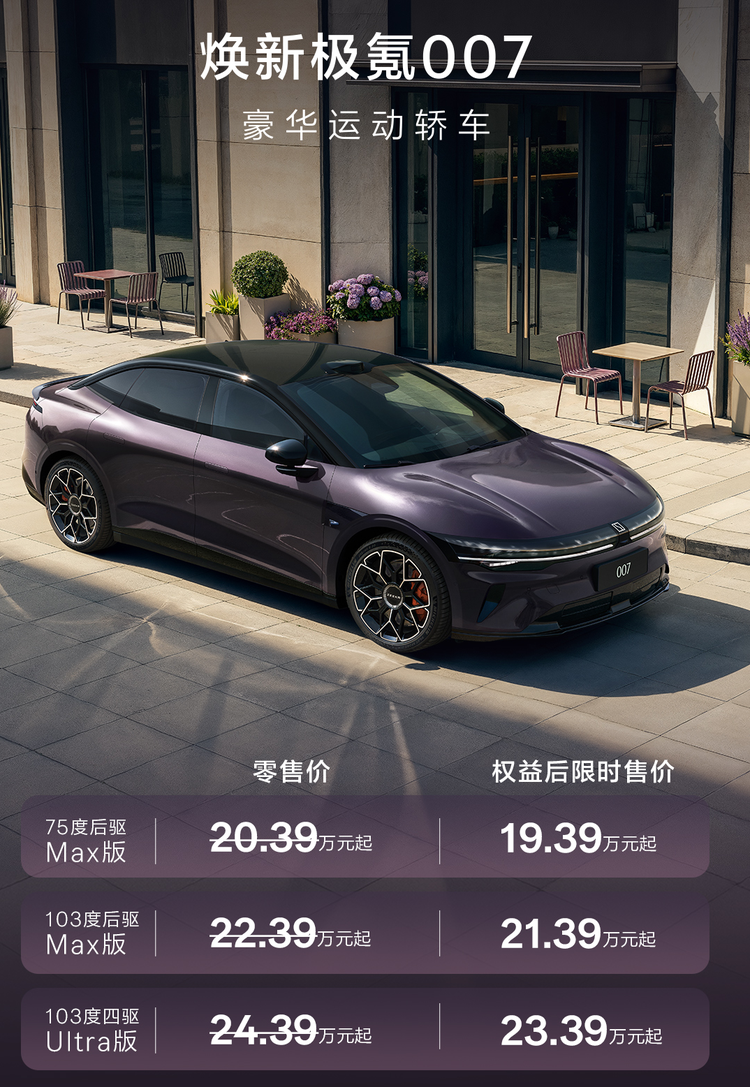 本次上市的焕新极氪007与极氪007GT,上市权益后限时价均为19.39万元-23.39万元;极氪001五周年纪念版同步限量发售,零售价36.5万元起。双产品线精准卡位20万级主流市场与30万+高端性能市场,形成“以价换质、以技破局”的产品矩阵,既满足年轻家庭与个性用户的全能需求,又为性能玩家提供典藏级选择。