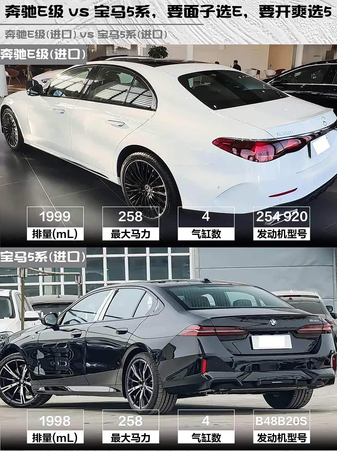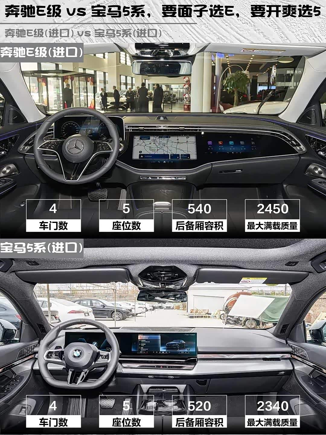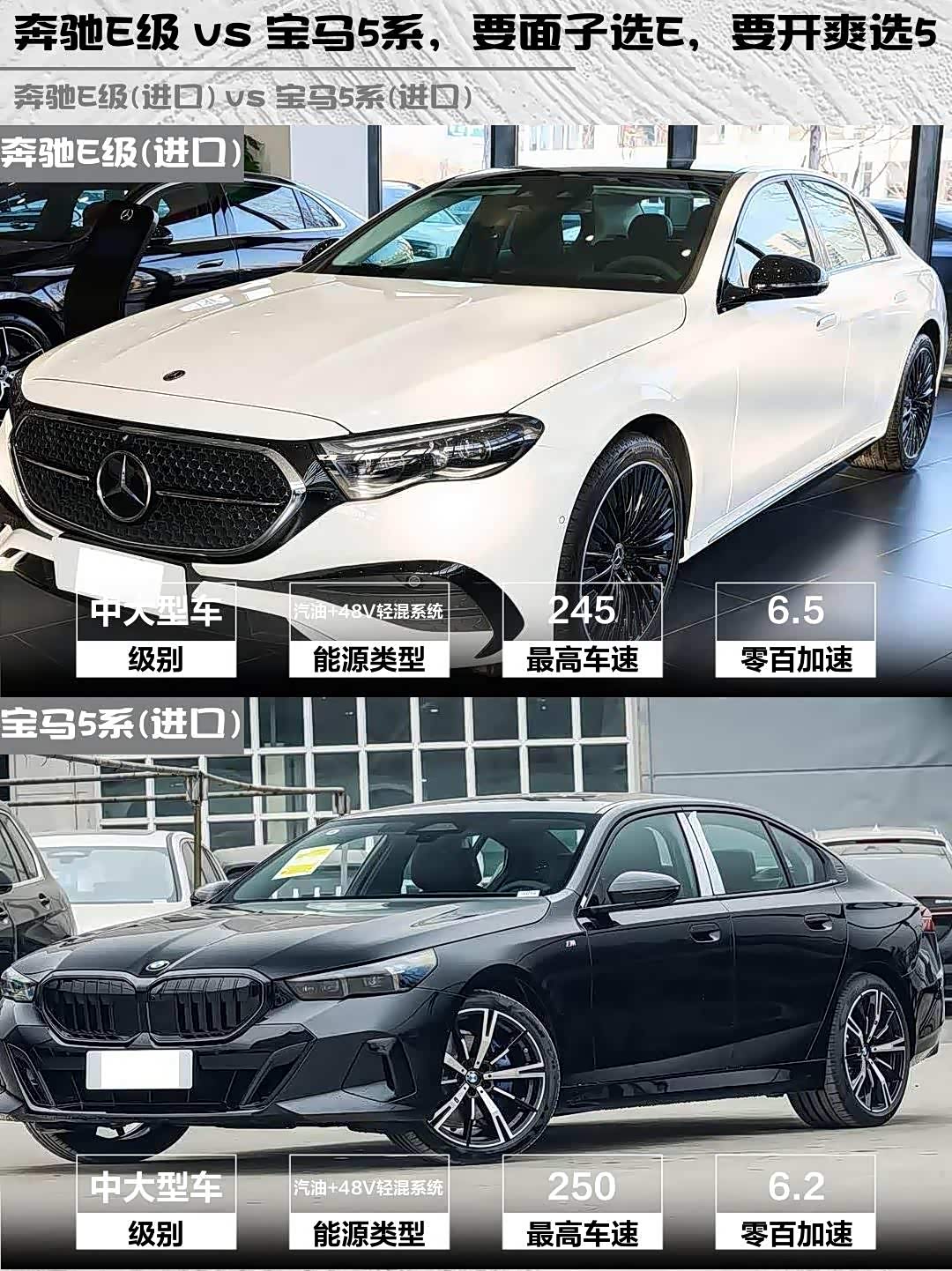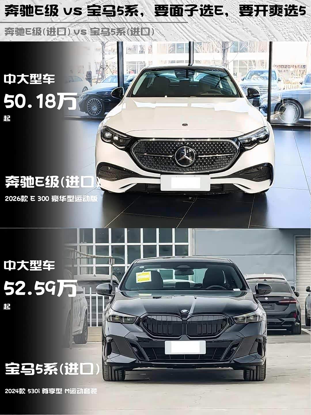 奔驰E级(进口)(参数|询价) 2026款 E 300 豪华型运动版 vs 宝马5系(进口) 2024款 530i 尊享型 M运动套装,这两台50万级进口豪华车到底怎么选?🤔 作为深度体验过两台车的车主,掏心窝子分享真实对比感受!