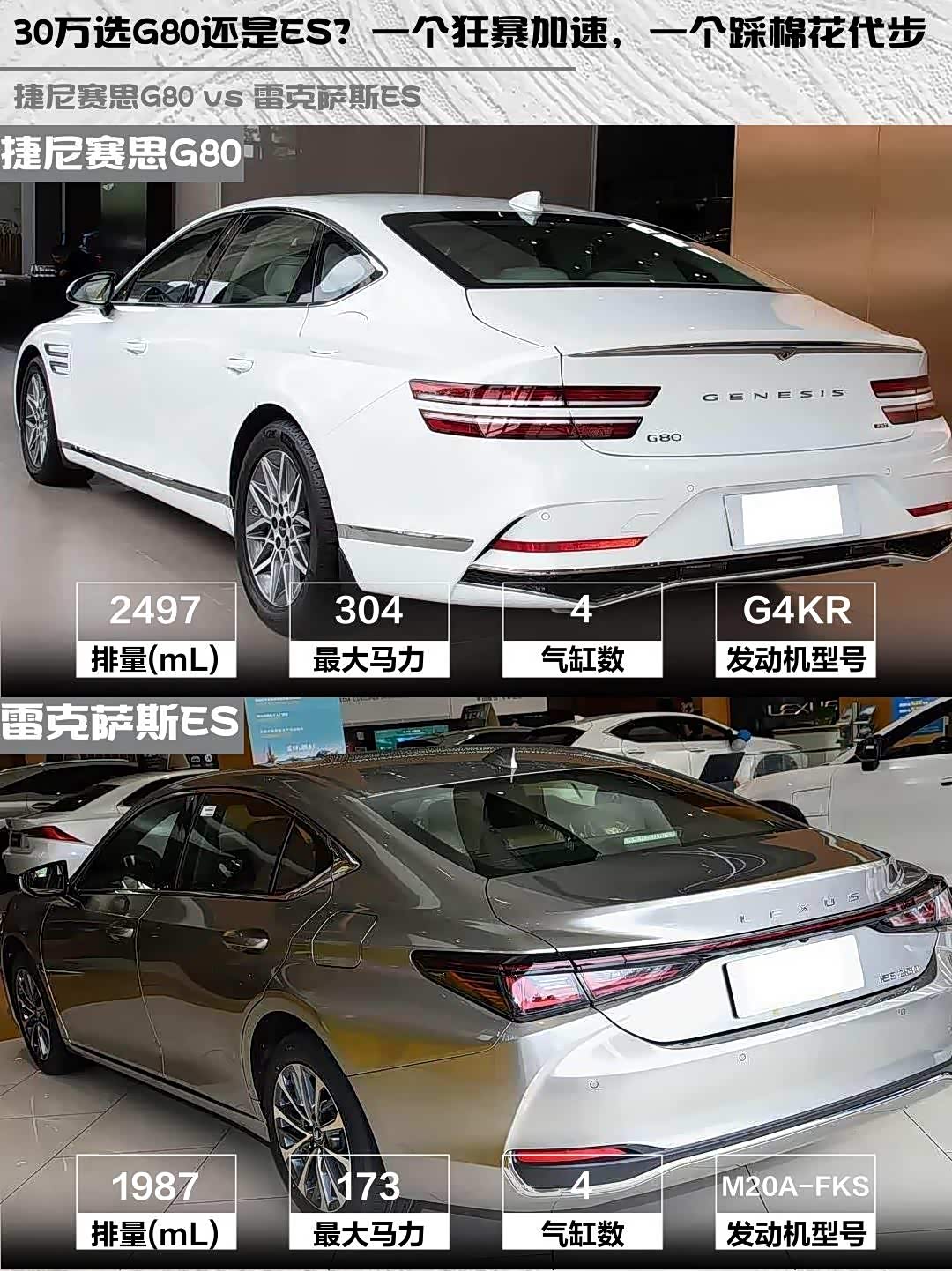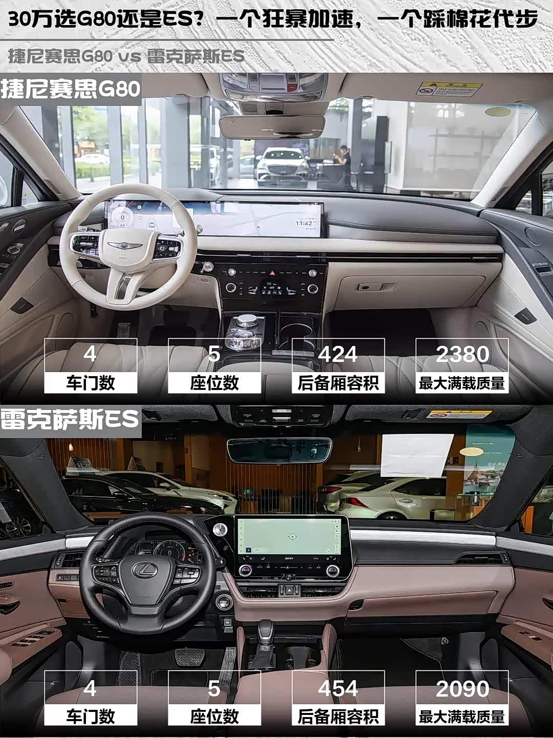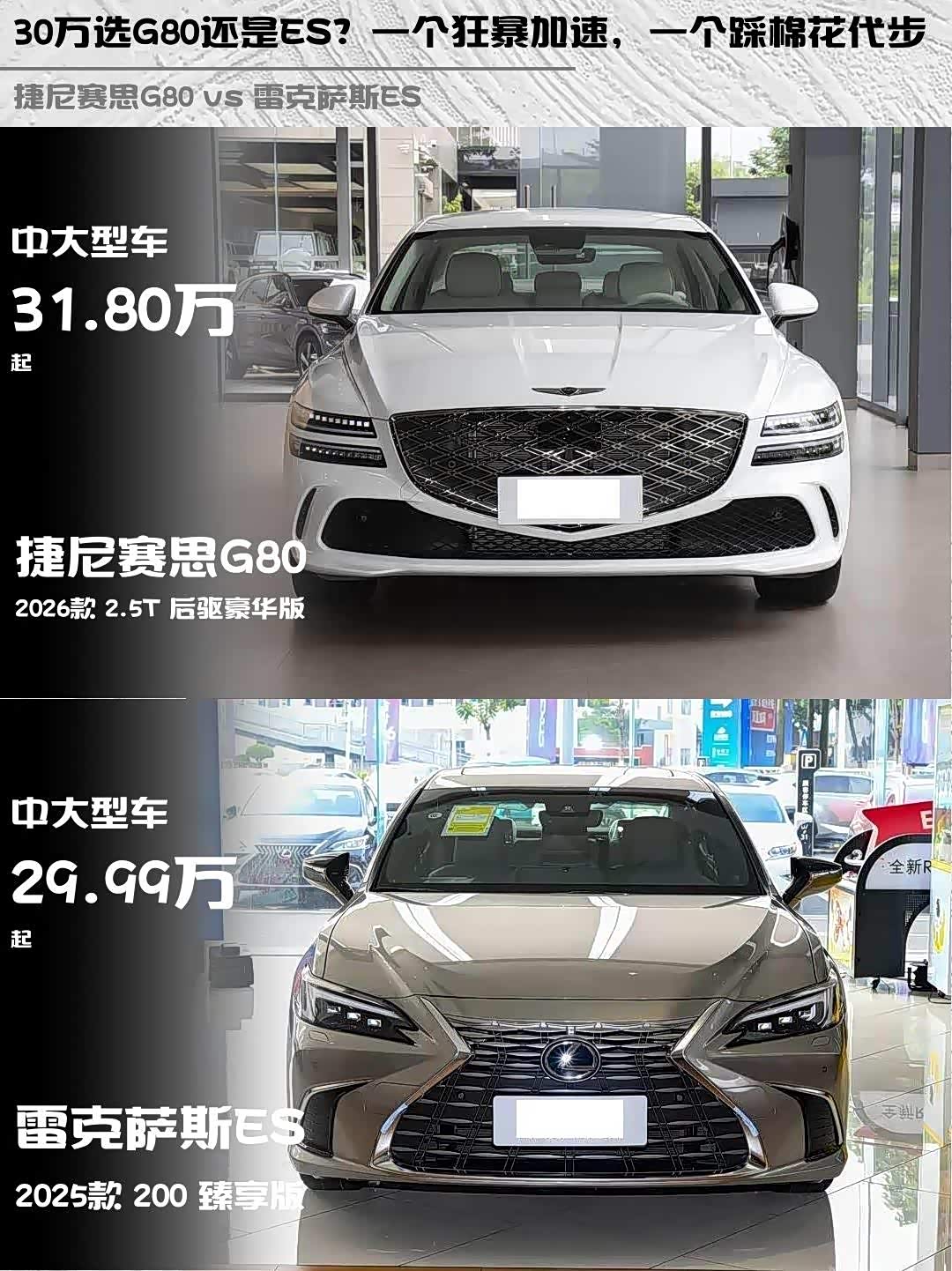 车家号·0浏览·2026-04-11 08:31 · 北京30万级豪华轿车怎么选?今天来聊聊 捷尼赛思G80(参数|询价) 2026款 2.5T 后驱豪华版和雷克萨斯ES 2025款 200 臻享版这对神仙打架的选手!