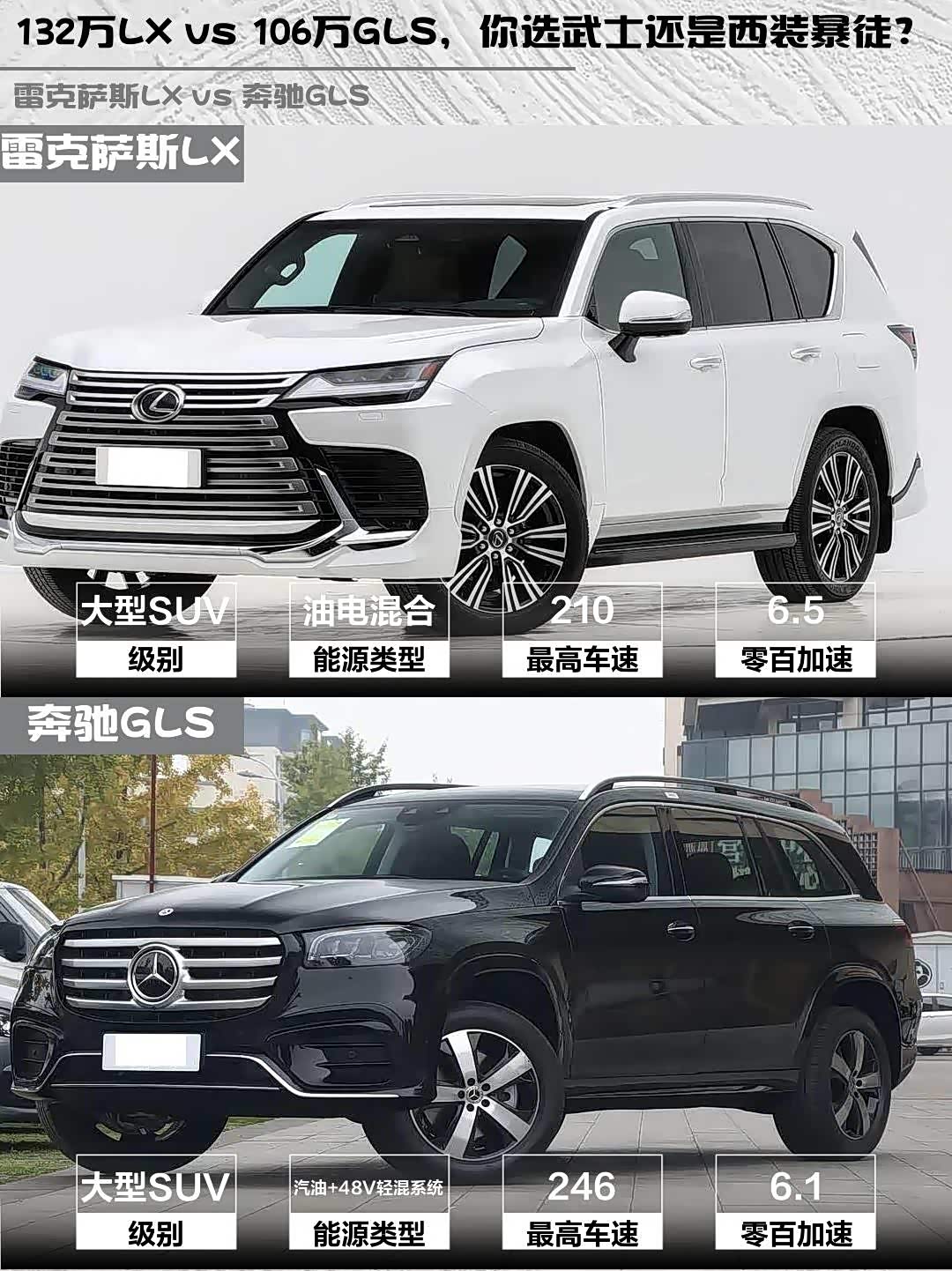最近后台好多人在问百万级SUV怎么选,今天拉出两款热门选手—— 雷克萨斯LX(参数|询价) 700h领界版(132万)和奔驰GLS 450动感型(106万),从硬核参数到实际体验给你们扒个明白!