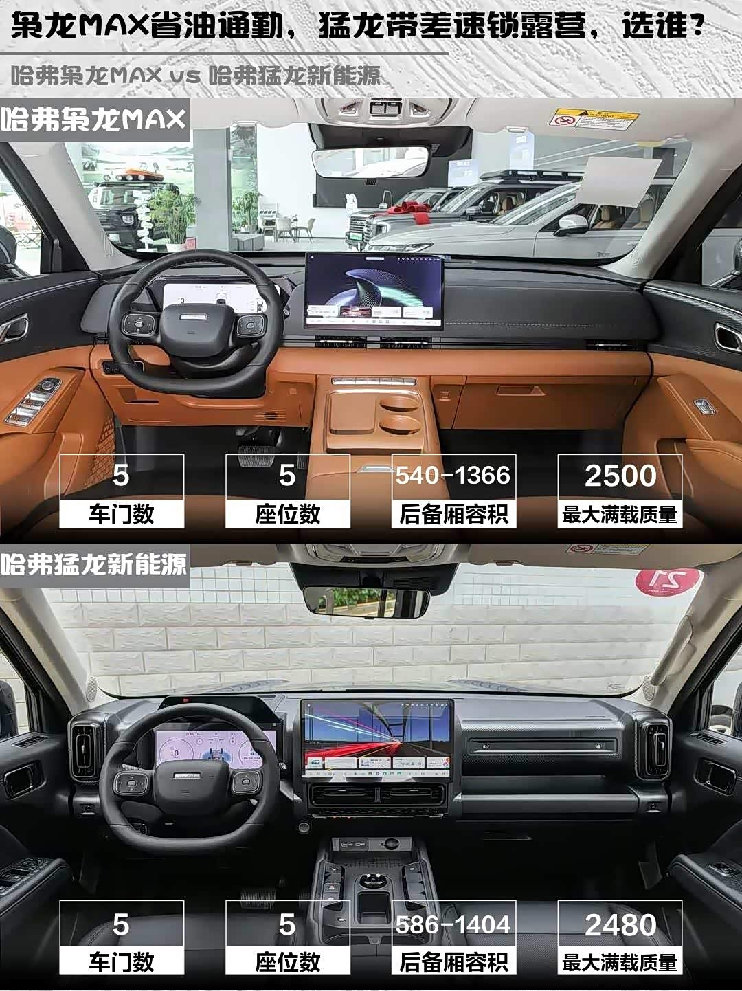 智能化配置上,两车都标配L2级辅助驾驶和14.6英寸中控大屏,但枭龙MAX的Coffee OS系统更流畅,语音控制支持更多功能,比如车窗控制等。猛龙的360全景影像+透明底盘对于方盒子造型来说很实用,停车更方便。🖥️