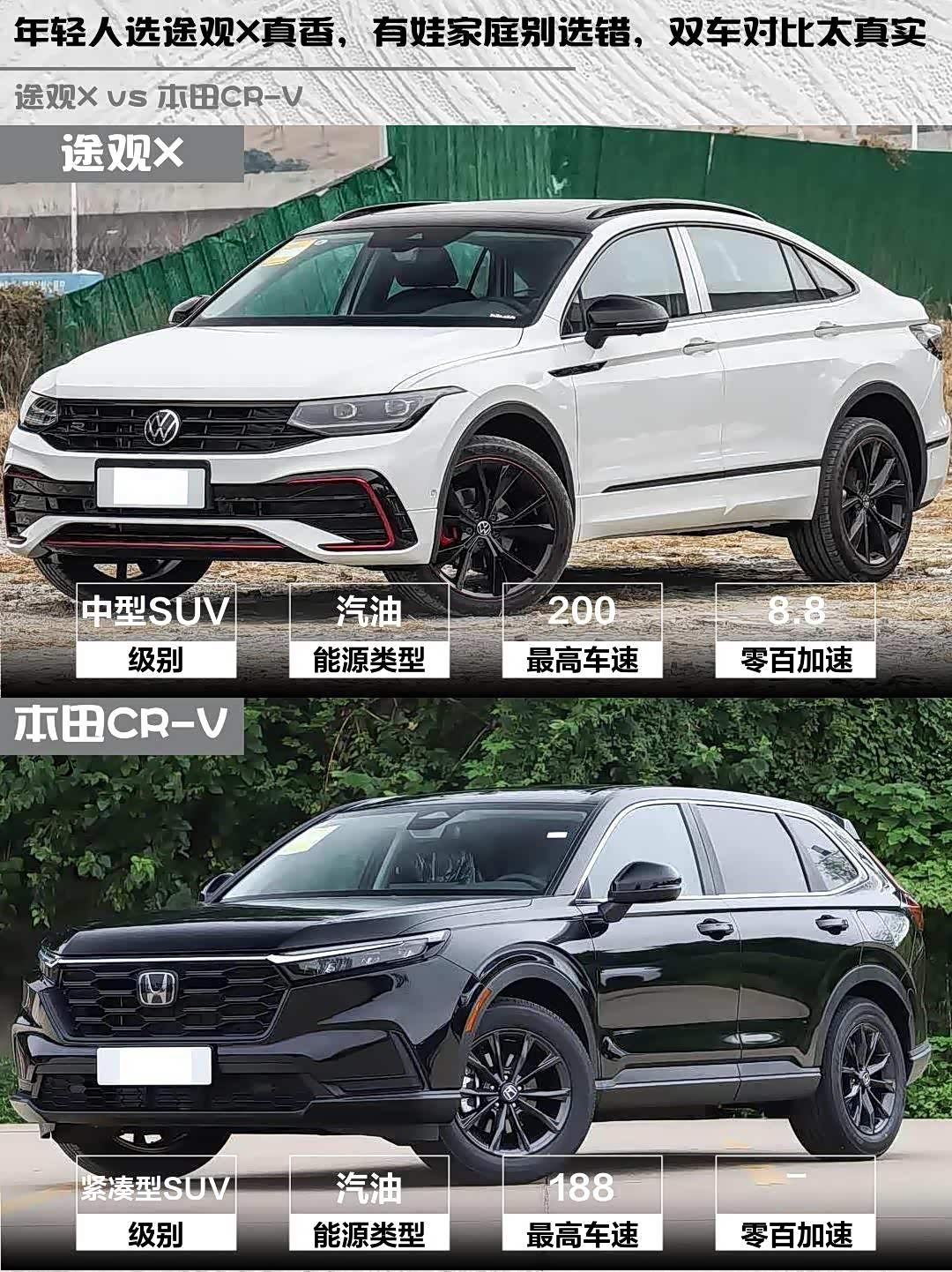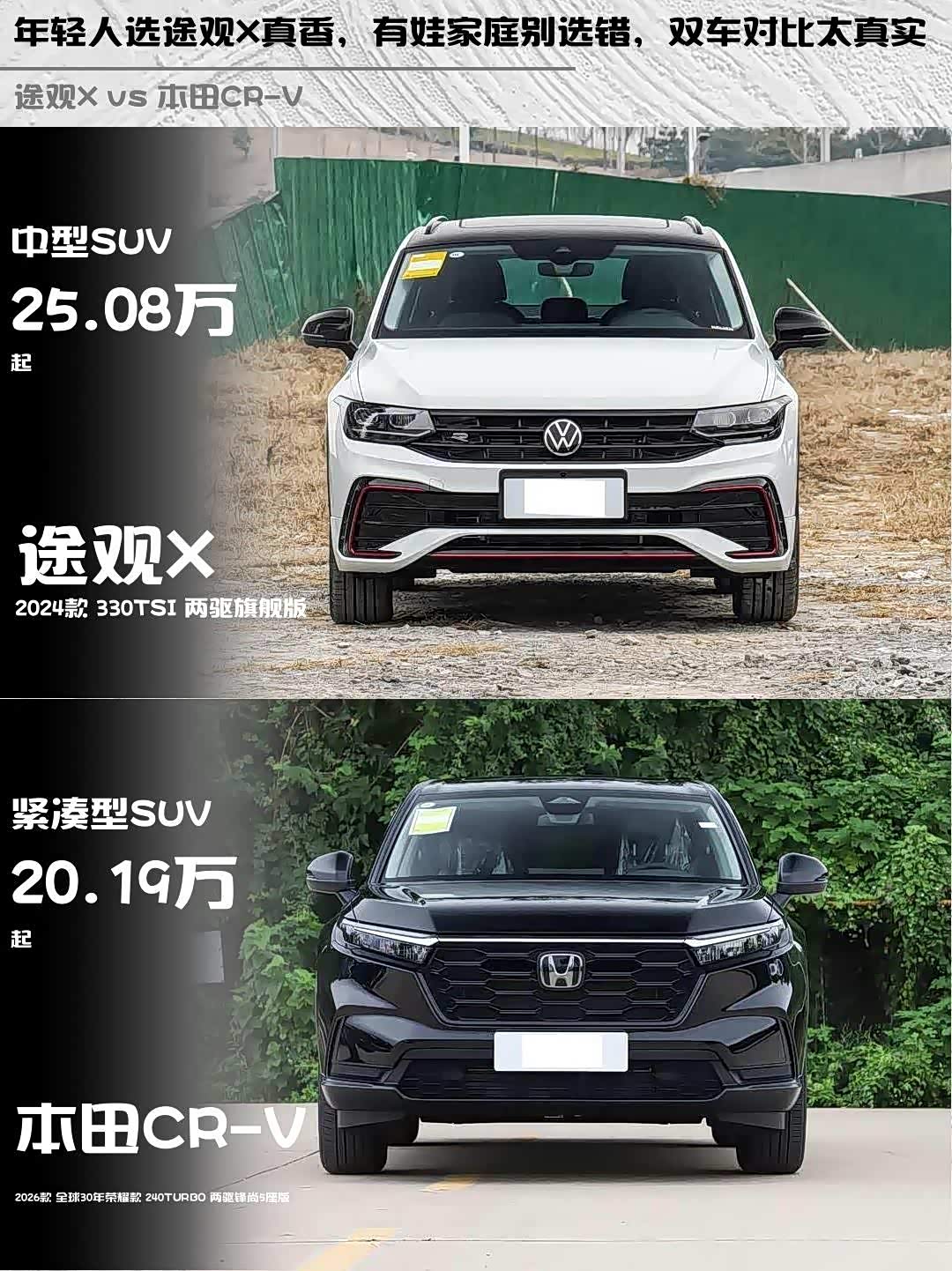最近在选车的朋友看过来!今天给大家深度对比两款热门SUV:途观X 2024款 330TSI 两驱旗舰版 vs 本田CR-V(参数|询价) 2026款 全球30年荣耀款 240TURBO 两驱锋尚5座版,纠结这两款的可以收藏了🔥