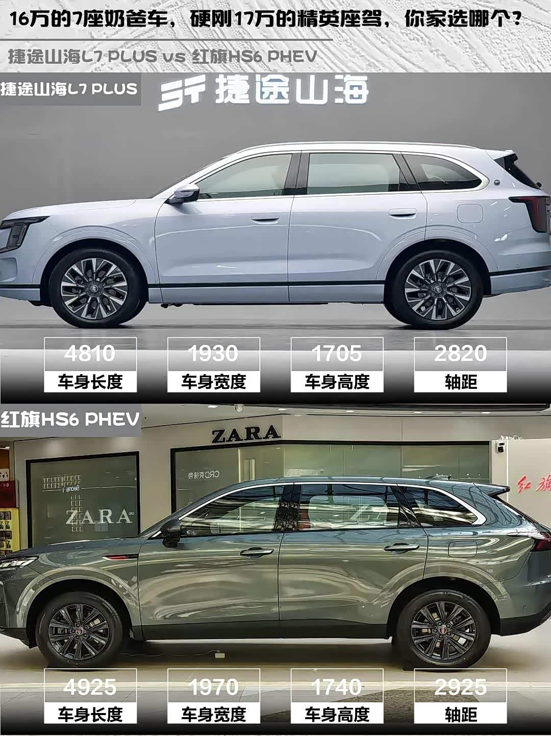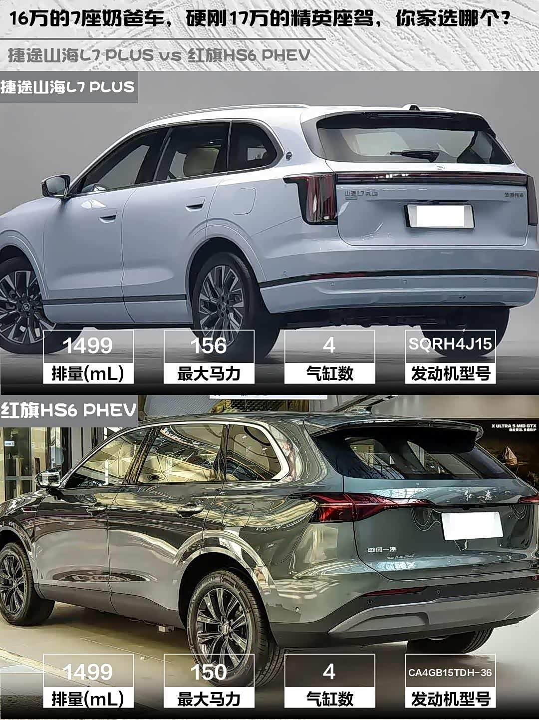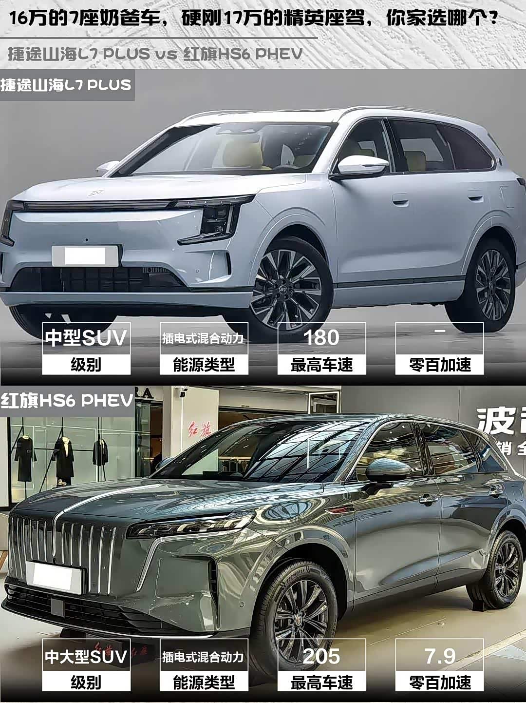 最近在选家用混动SUV的朋友看过来!👀 今天深度对比两款热门车型—— 捷途山海L7 PLUS(参数|询价) 2026款 220km 旗舰版 7座 vs 红旗HS6 PHEV 2026款 145智混版,实测干货分享来啦!🔥