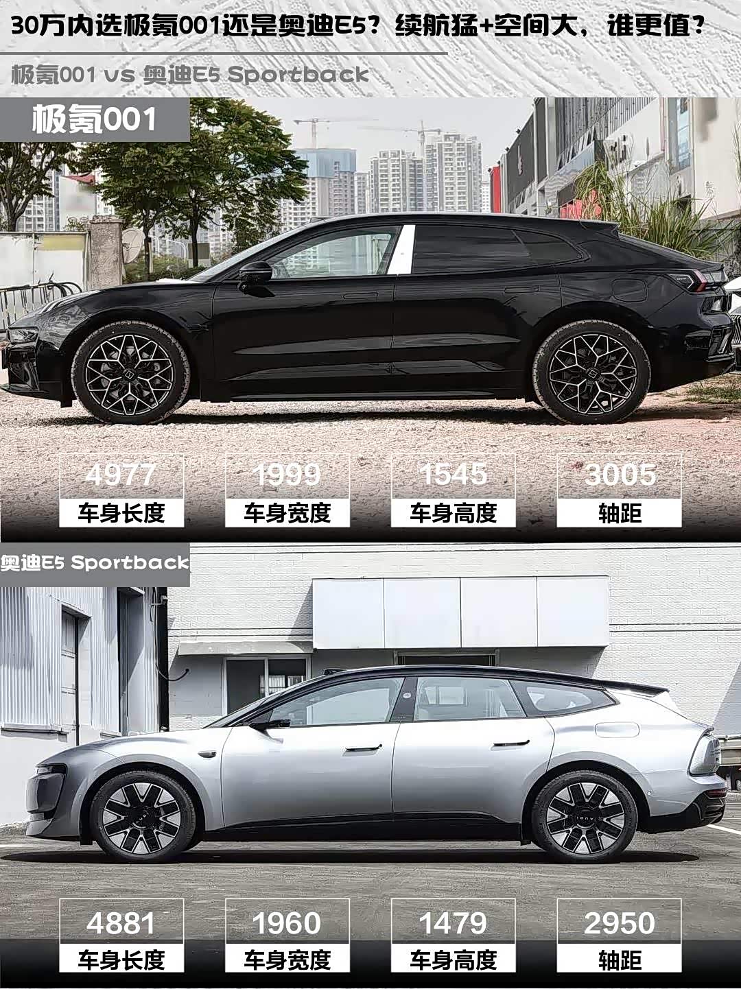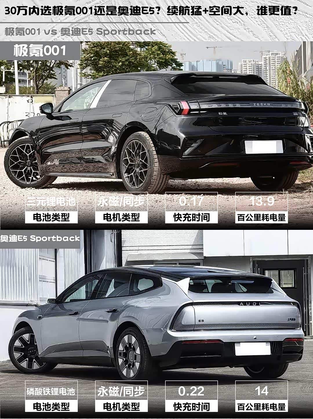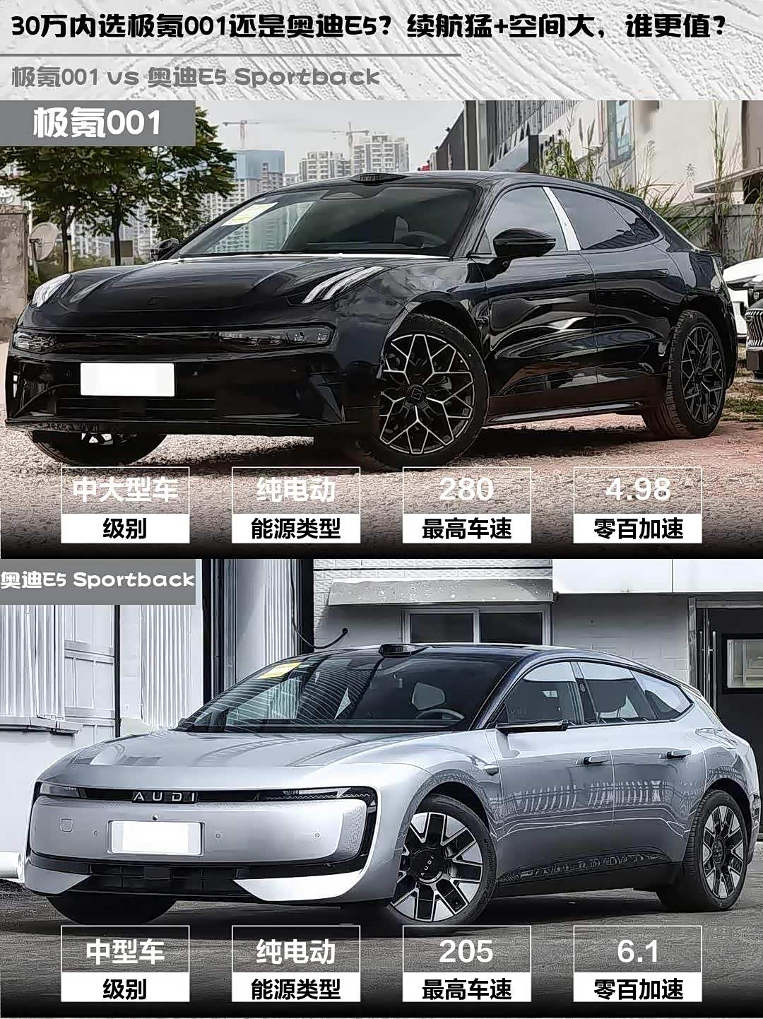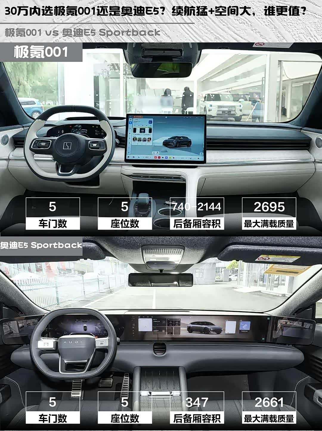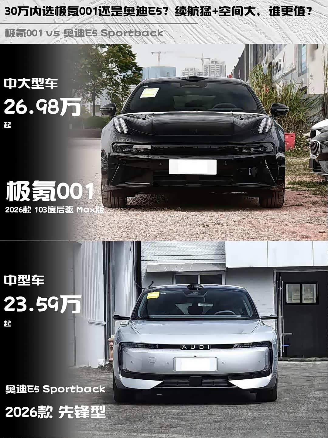 要续航猛、空间大、配置顶,选极氪001;更看重品牌调性、舒适驾控,选奥迪E5。两台车性格差异明显,建议都去试驾体验下!