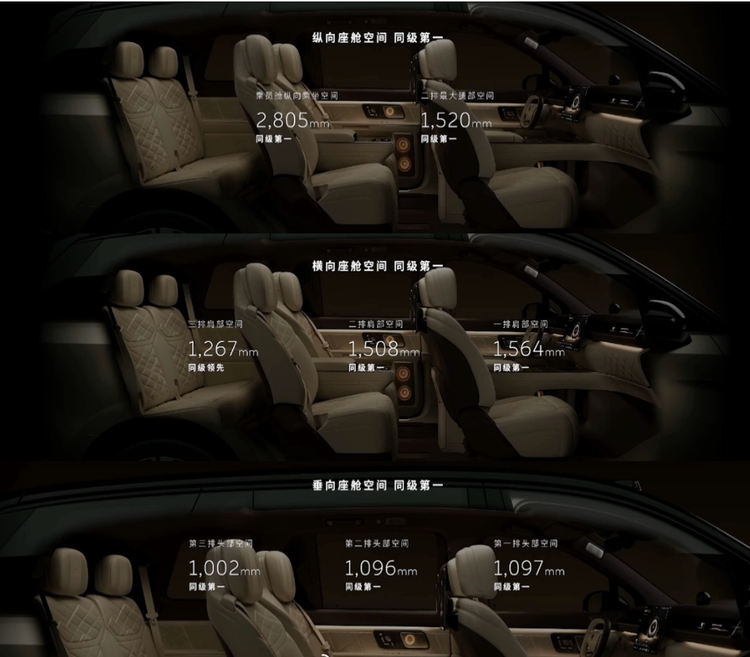 **在空间维度**,3250mm轴距营造出纵向超2.8米的座舱空间,配合816L前后备箱容积,实现"6人13箱"的装载能力,解决了行政SUV"乘坐与装载不可兼得"的行业难题。