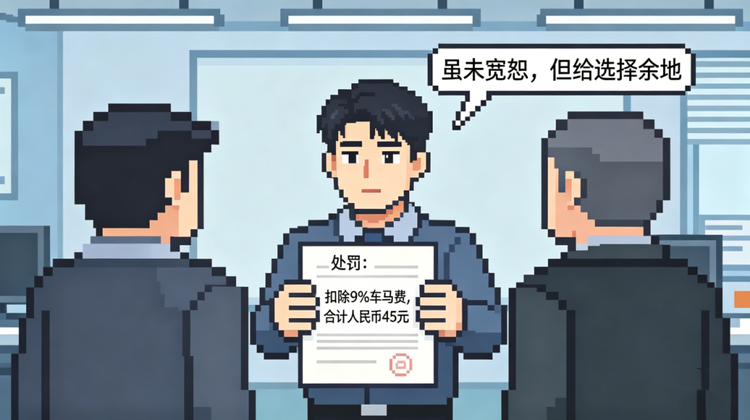 于是,他们恩威并施,告诉我处罚仅仅是需要扣除你9%的车马费——合计人民币45元,你是否能接受。