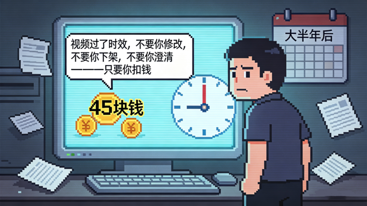 而当活动结束大半年过程里找到你问题的时候,他们会说视频过了时效,不要你修改,不要你下架,不要你澄清——只要你扣钱。