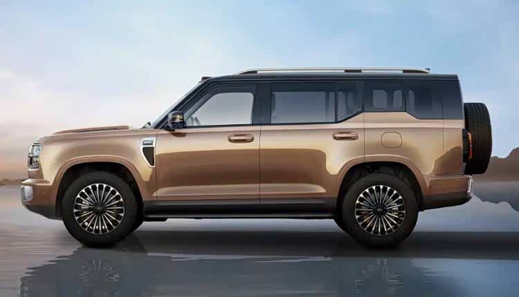 侧面线条平直,轮眉与腰线凸显力量感,双色车身提升时尚度。尾部采用直列式尾灯、侧开尾门与外挂备胎,硬派风格鲜明。尺寸方面,新车预计车长5.1-5.2米、车宽近2米、轴距3-3.1米,属中大型SUV范畴。