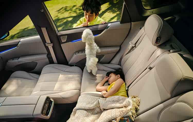 既然长续航和智驾都有了,那对于在副驾和在后排的家人来说,也有能够让她们放松的配置,来舒缓长途出行的疲劳。