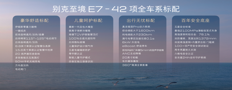 别克至境 E7 标配了 42 项豪华舒适配置,要注意,别克至境 E7 标配的这些配置并非是为了让 PPT 看上去好看,而是实打实的实用性配置。