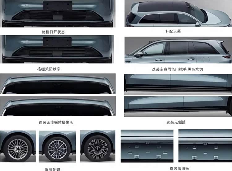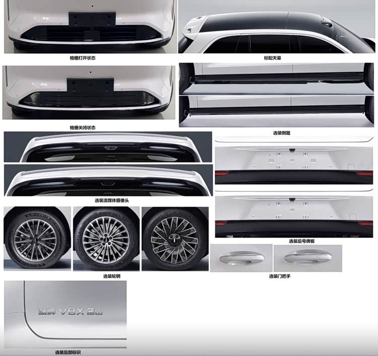 外观方面,魏牌V8X延续魏牌新一代家族化设计语言,整体造型大气稳重,兼顾豪华质感与家用属性,细节设计贴合中大型SUV的气场。申报图显示,新车前脸采用大尺寸格栅设计,内部辅以精致的镀铬饰条修饰,搭配两侧犀利的LED大灯组,灯组造型规整,点亮后辨识度拉满,前包围配备贯穿式进气口与银色护板,既优化空气动力学性能,又增添几分运动氛围,整体前脸设计简洁大气,符合高端家用SUV的审美需求。