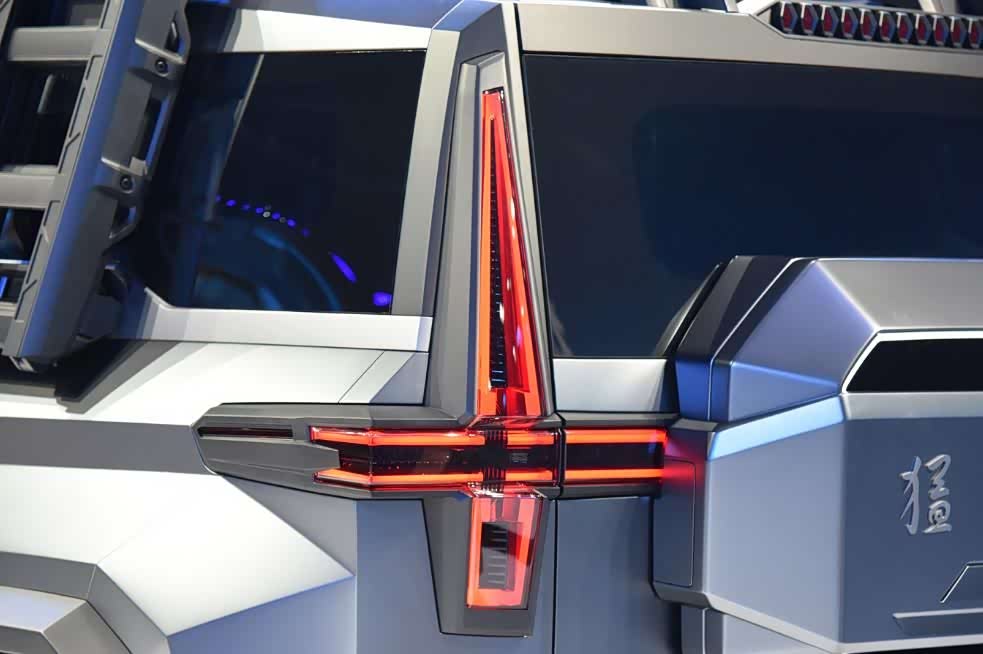 那么猛士917这款大型硬派SUV,各方面有着怎样亮眼的表现呢?我们接着往下看,首先在外观造型方面,作为一款全新的新能源硬派SUV,猛士917整体展现出了十足的机甲风格,看起来特别的迷人,整体的造型以“东方醒狮”为灵感,有一种不怒自威的即视感,前脸扁平化的六边形中网,配合前卫的机甲元素,以及两侧威严的大灯加持下,展现出了非常浓郁的科幻色彩,车身侧面,整体非常具有力量感,方正的造型之上,加入了非常有野性的线条点缀,配合高达威猛的轮毂,以及较高的离地间隙,将硬派越野车的气息发挥的淋漓尽致,当然尾部造型也是与整车遥相呼应,不管是外挂式的备胎,还是非常个性的布局,都散发出了十足的机甲风格。