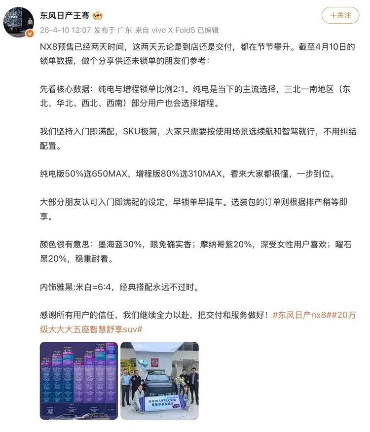 “NX8预售已经两天时间,这两天无论是到店还是交付,都在节节攀升。”4月10日,东风日产汽车销售有限公司新能源品牌总经理王骞在微博上透露了NX8的最新订单情况。
