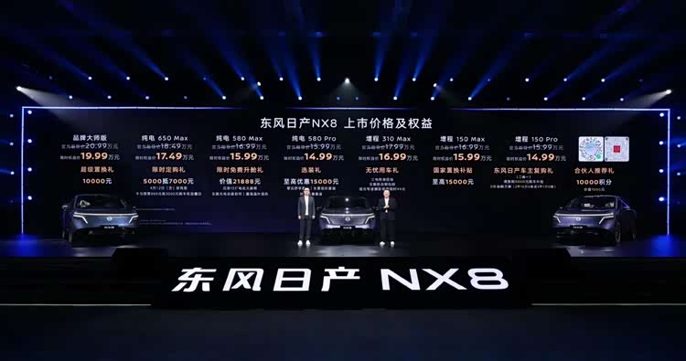 4月8日上市的NX8,直接以14.99万元的价格起售,整体竞争力相当强。这车价格定的非常实诚,对比配置等来看,属于实惠的过日子舒适车。不仅是价格,空间大,配置高。该车在15万的价格上就给了激光雷达、momenta辅助驾驶、宁德时代电池、800V平台和 5C充电,并且实现了增程和纯电同价。所以,NX8订单也爆了,东风日产高管在现场说,该车1小时订单为8432个订单,表现相当不错。