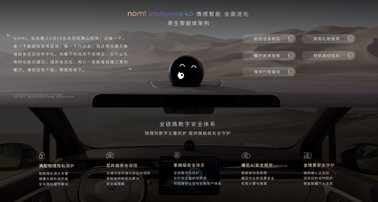 新车搭载最新的NOMI Intelligence 4.0系统,情感智能全面进化,搭载全新一代车载语音识别大模型,车控识别准确率提升20%,嘈杂环境识别准确率提升25%,支持中英文混说识别,支持多地方言识别。此外,新车还在座椅靠背、车门饰板等处加入了山水刺绣元素,进一步提升内饰的豪华感。